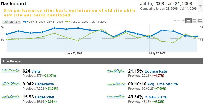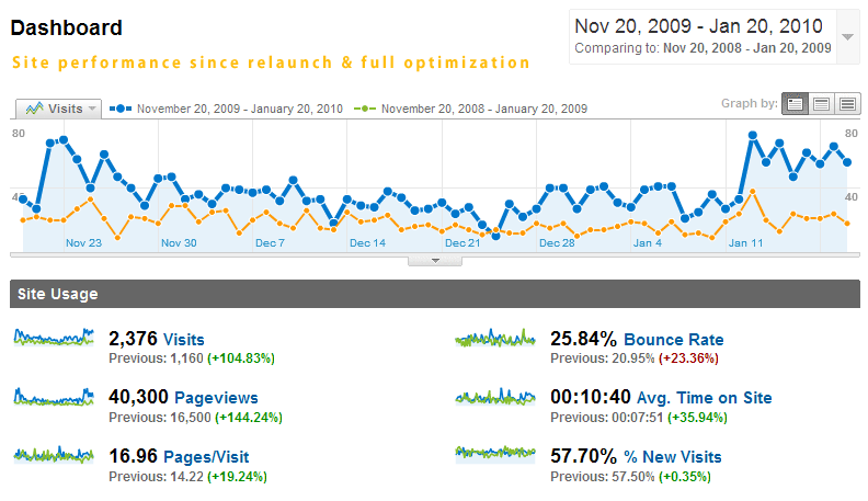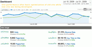 - Results after full optimization of a relaunched site using a new platform. The increased bounce rate is largely due to traffic from Stumbleupon.com and yet is still very acceptable. Also note the improvement during the recession — compared to the better economy the previous year.